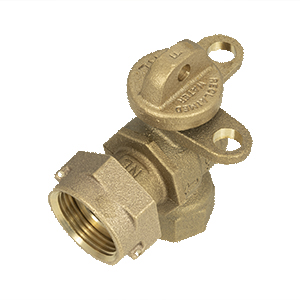FOR RECLAIMED WATER USE - NO LEAD 5/8" ANGLE BALL VALVE, PAD WING 3/4" FEMALE IRON PIPE THREAD by 5/8"x3/4" & 3/4" METER SWIVEL NUT |